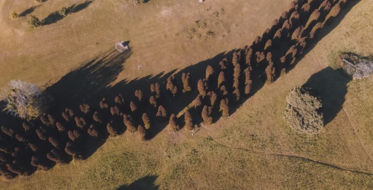 From the air to the ground: rows of trees in an expansive hilly landscape